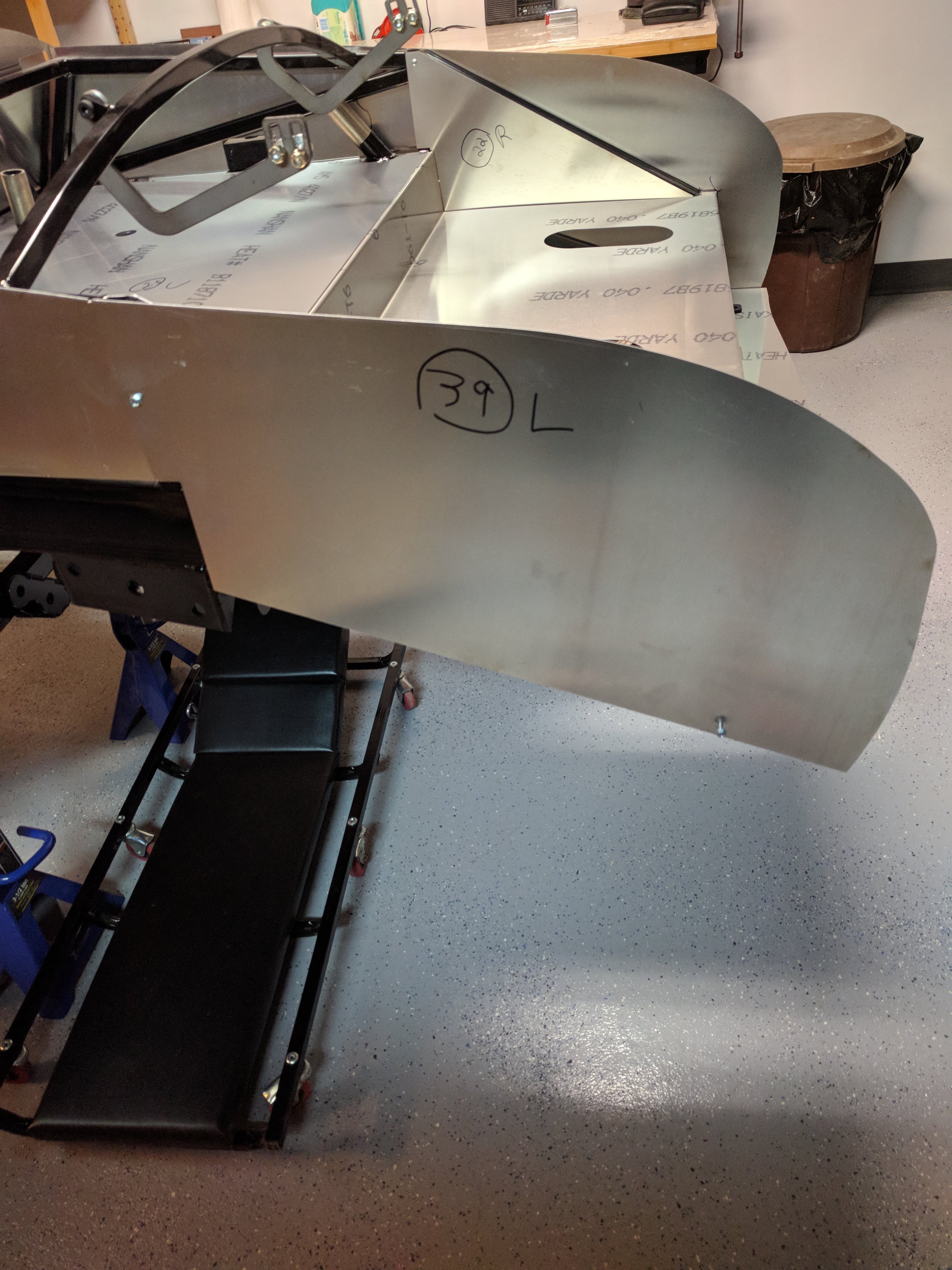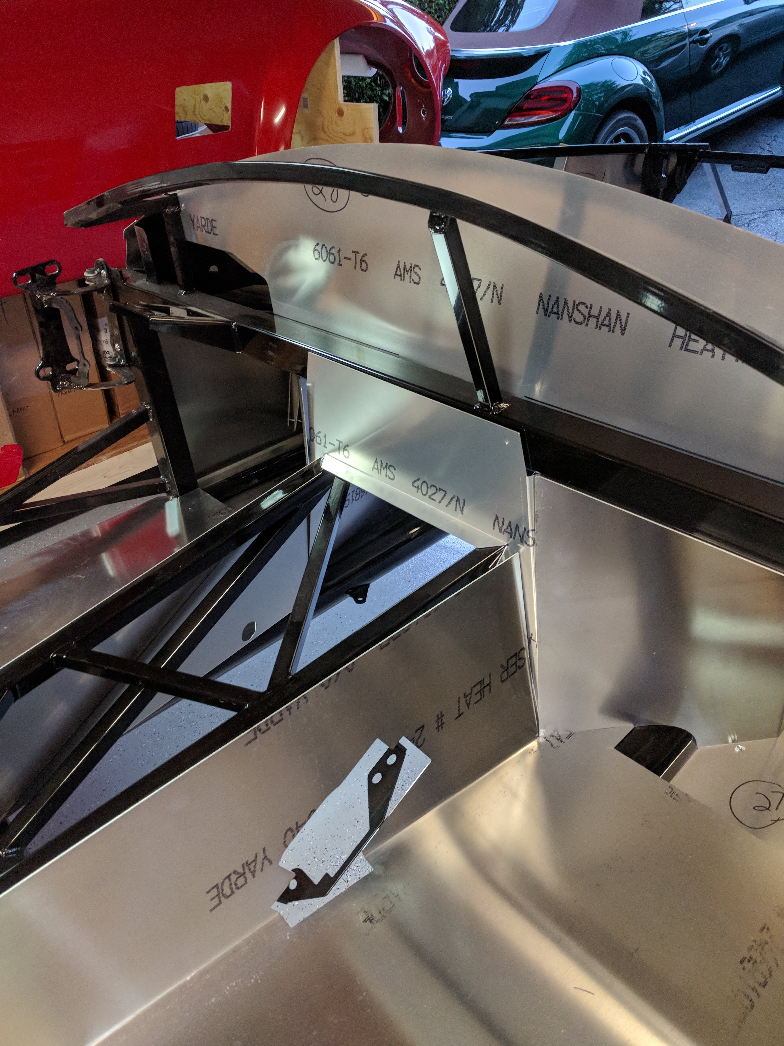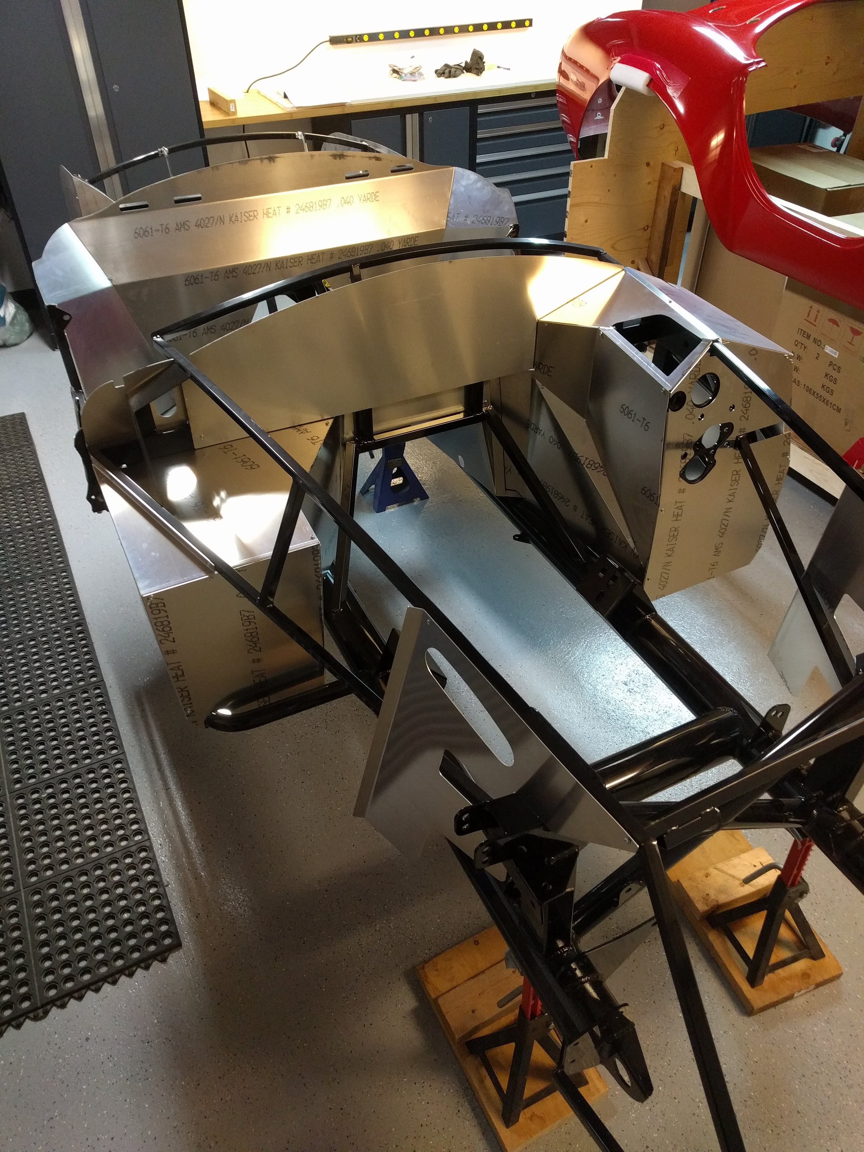 From the factory the frame with aluminum panels attached. The panels were attached the screw only. The final product will have the aluminum panels powder coated (painted), drilled, riveted and siliconed. This is view of the engine bay. May 13, 2018Cockpit from right side. May 14, 2018