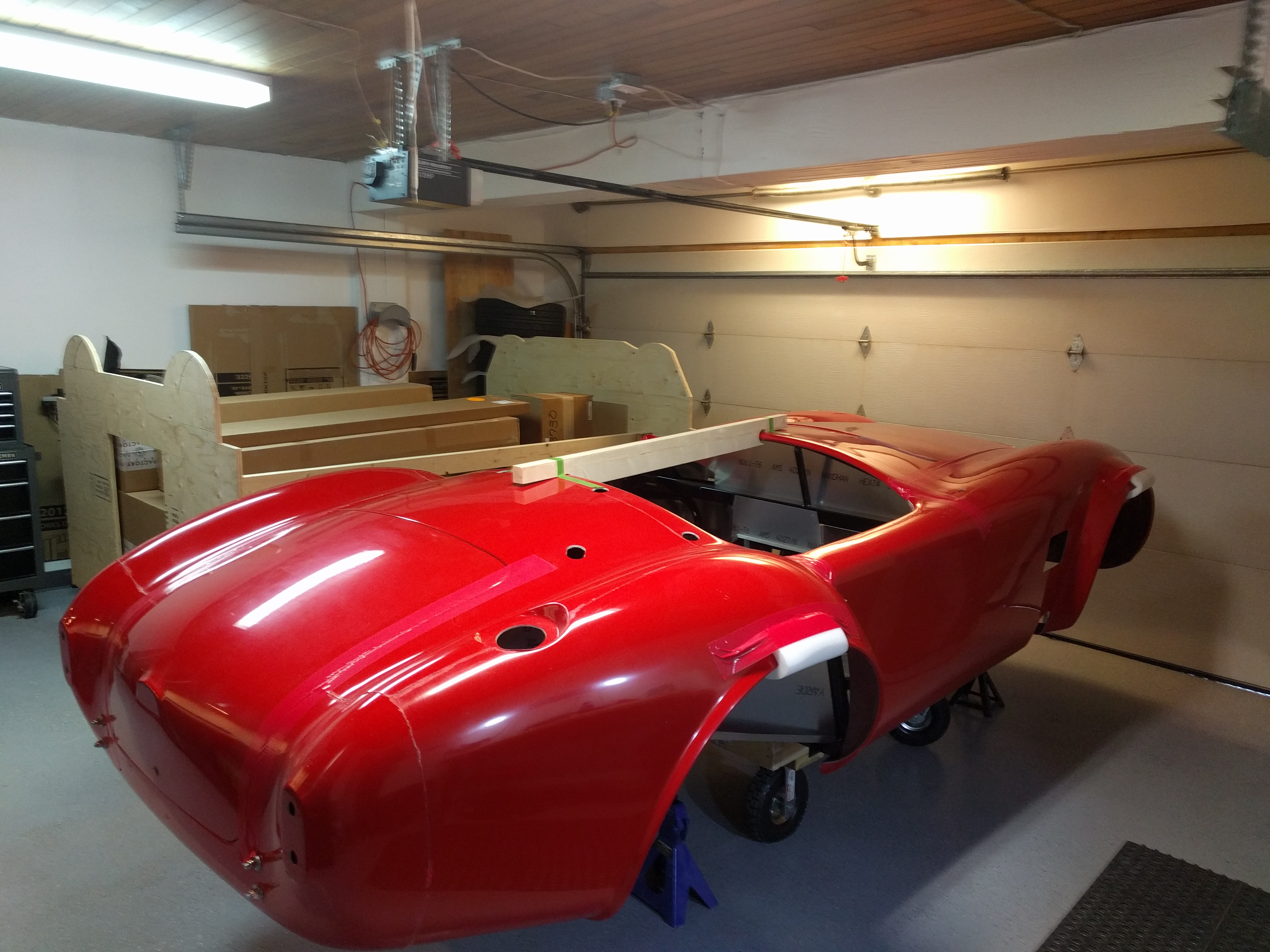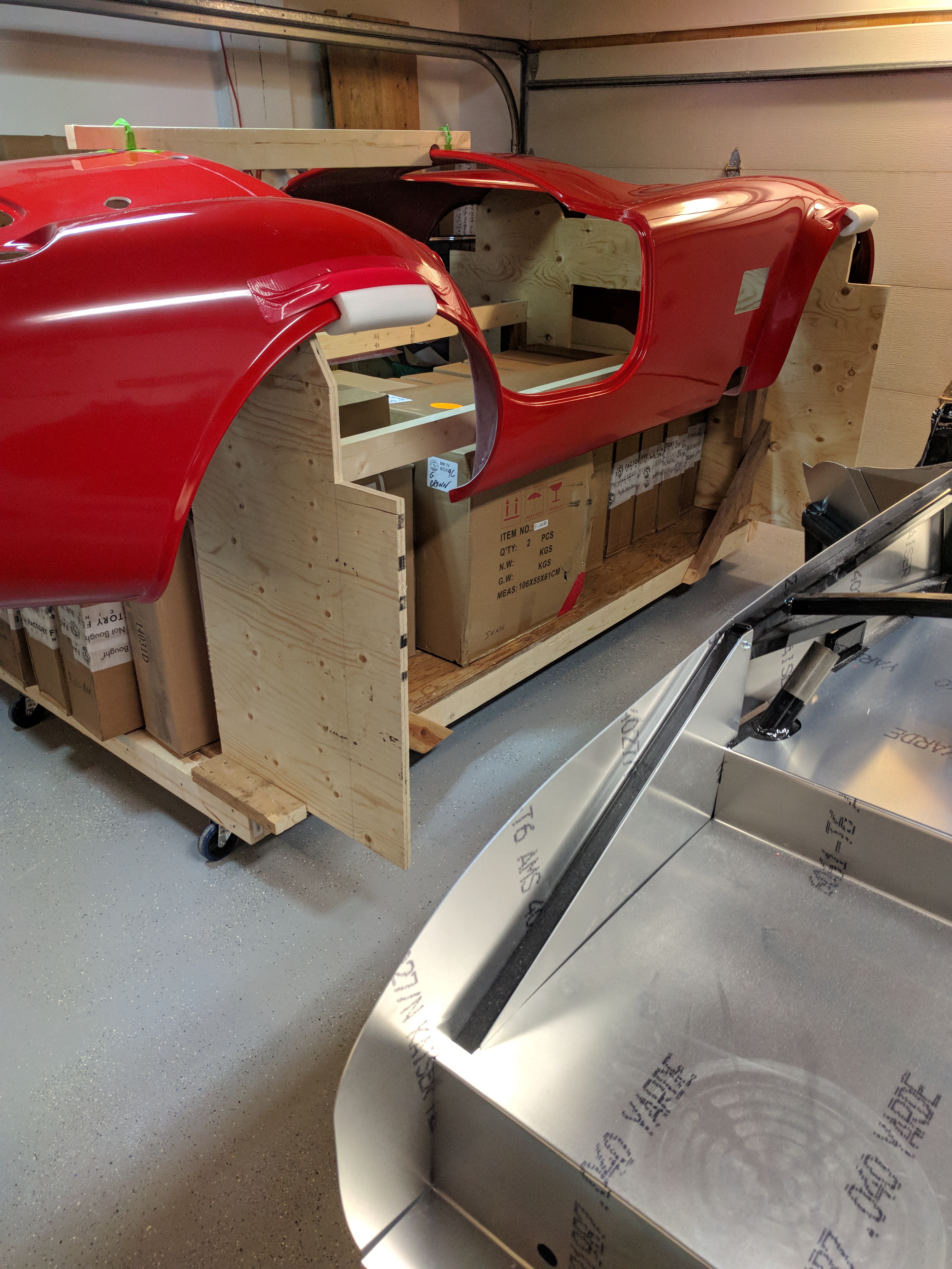 This body, frame and aluminum panels arrive with the first shipment of parts. The plywood structure in background of the picture is called a “buck”. The buck is used to hang the fiberglass body so it does not stretch.