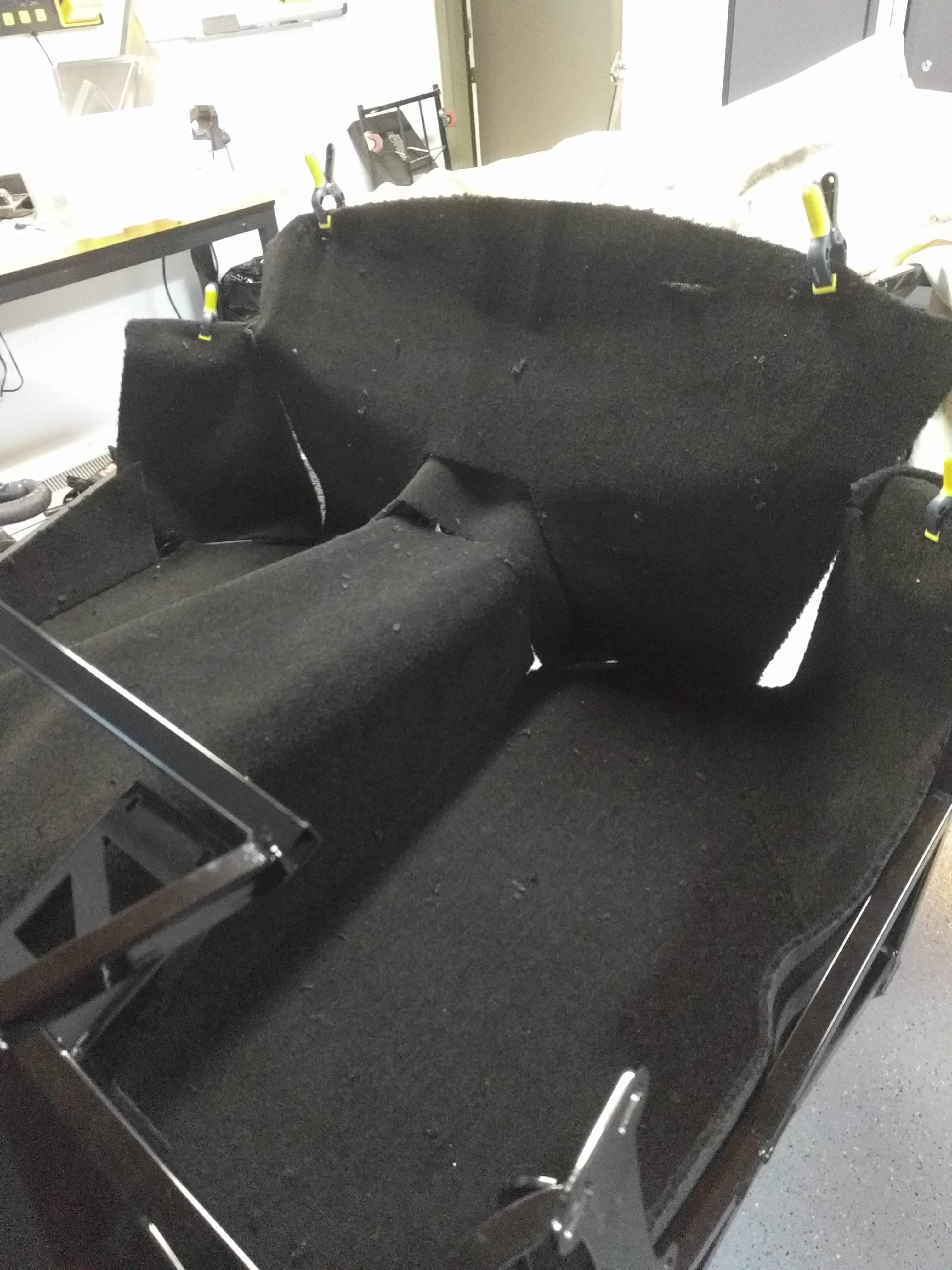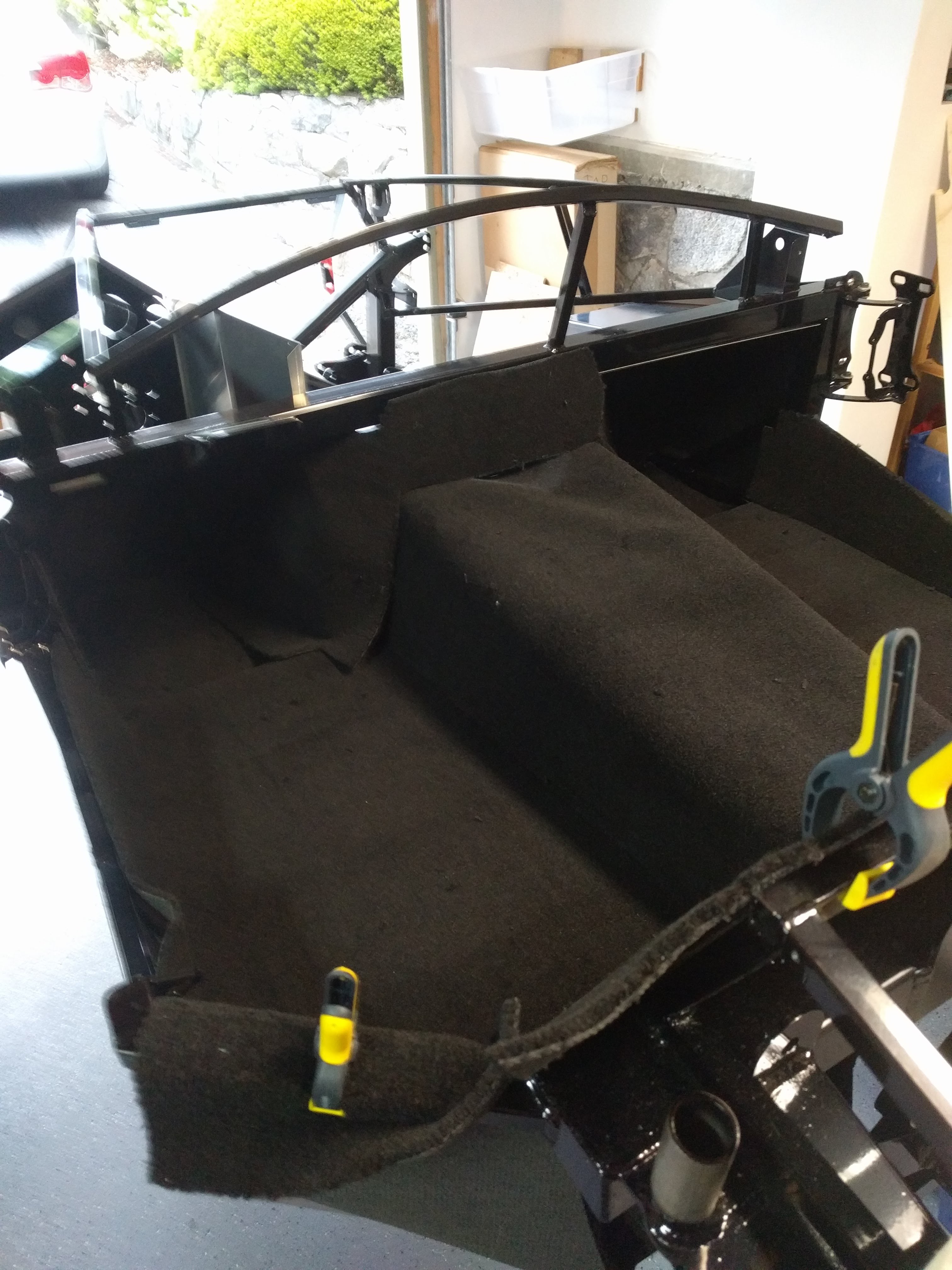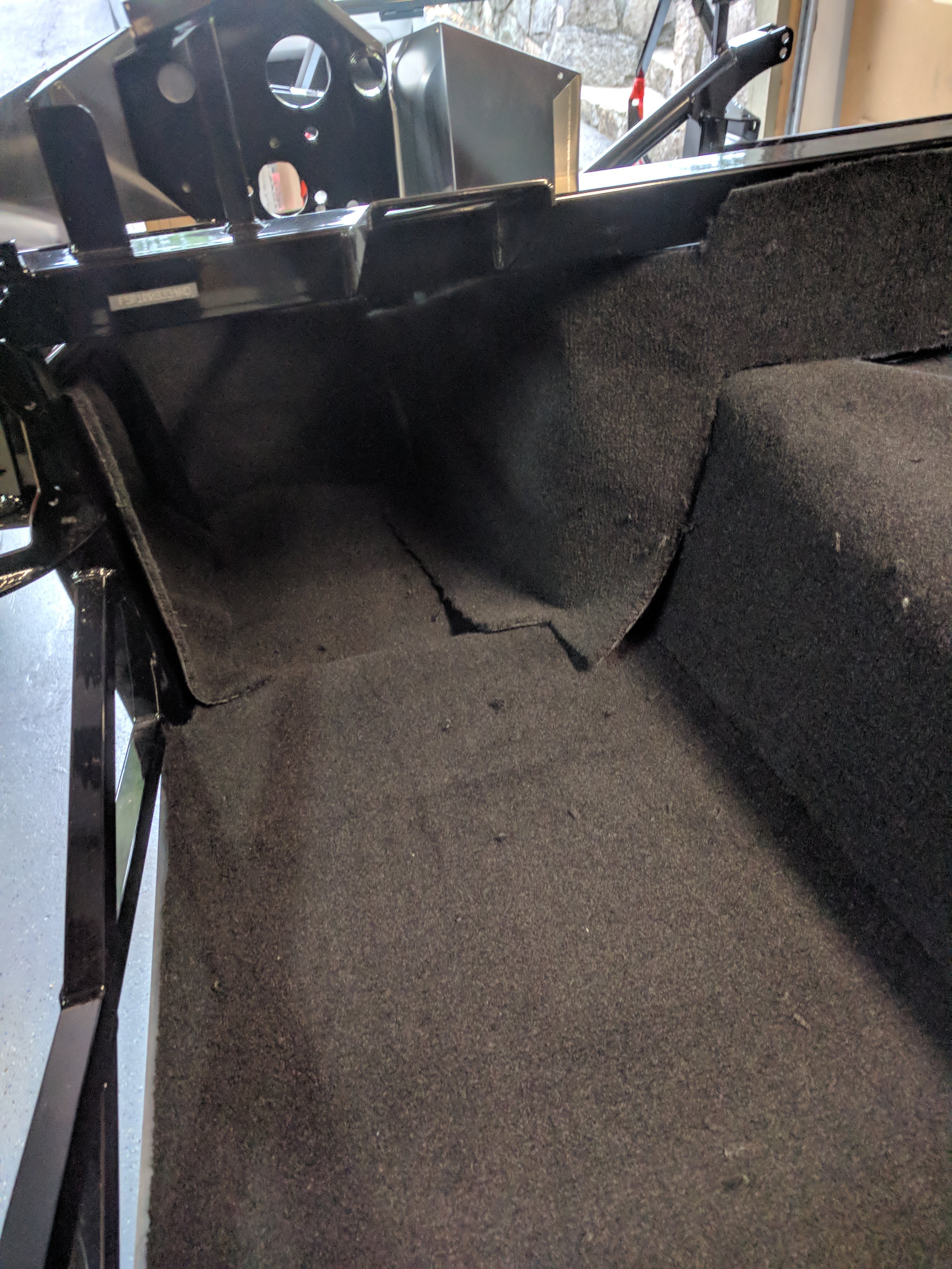 A mock-up of the interior with the Dask board install with tape. May 13, 2018My dials including reverse speedometer. Other dials water temperature, oil pressure, volts, fuel level, clock, tachometer and oil temperature. May 18, 2018Parking brake or E-brake. July 29, 2018Mock-up of carpeting cockpit looking at the dash. May 20, 2018Mock-up of carpeting left cockpit. May 20, 2018Mock-up of the carpeting the back of the cockpit. May 20, 2018