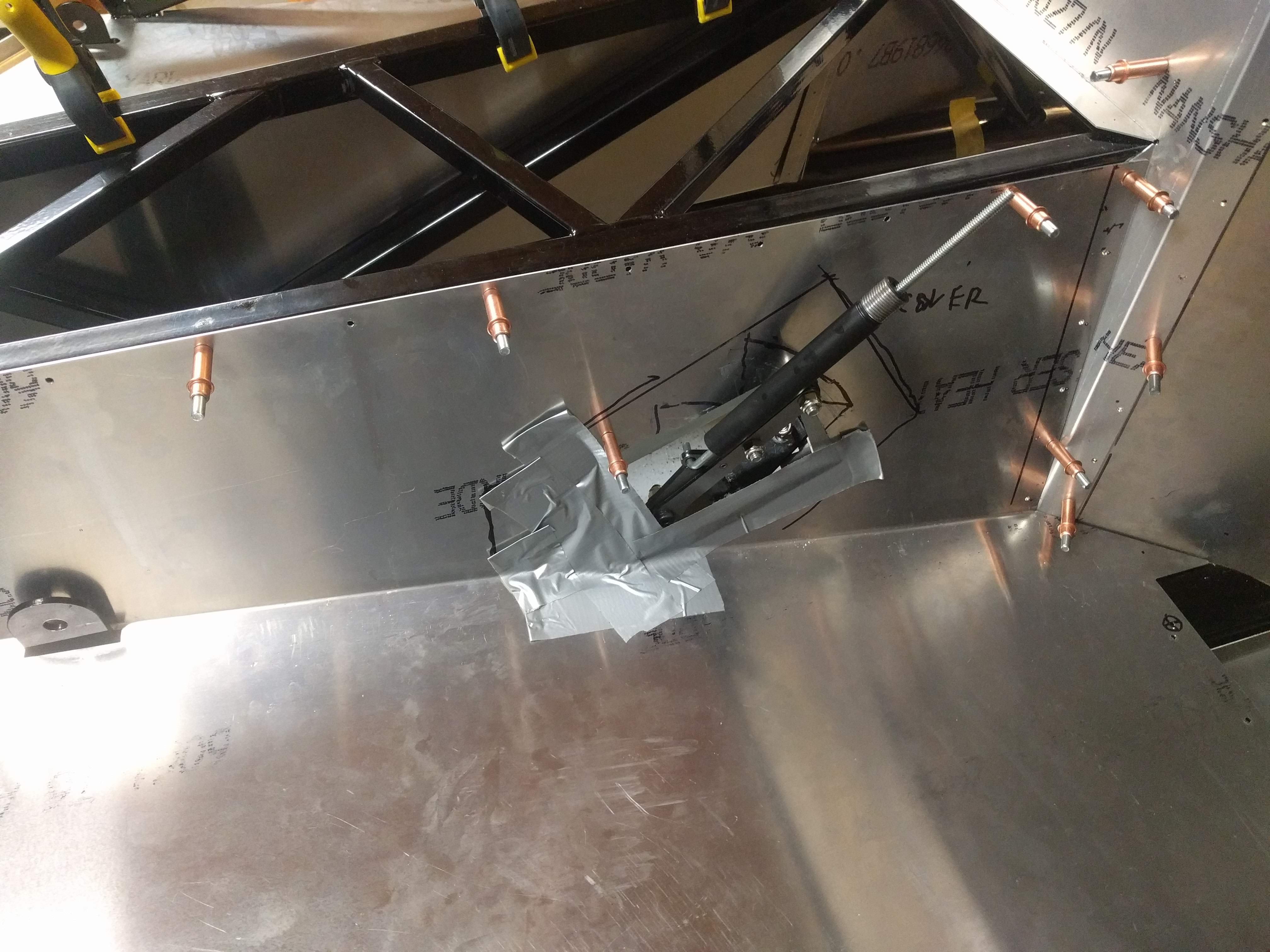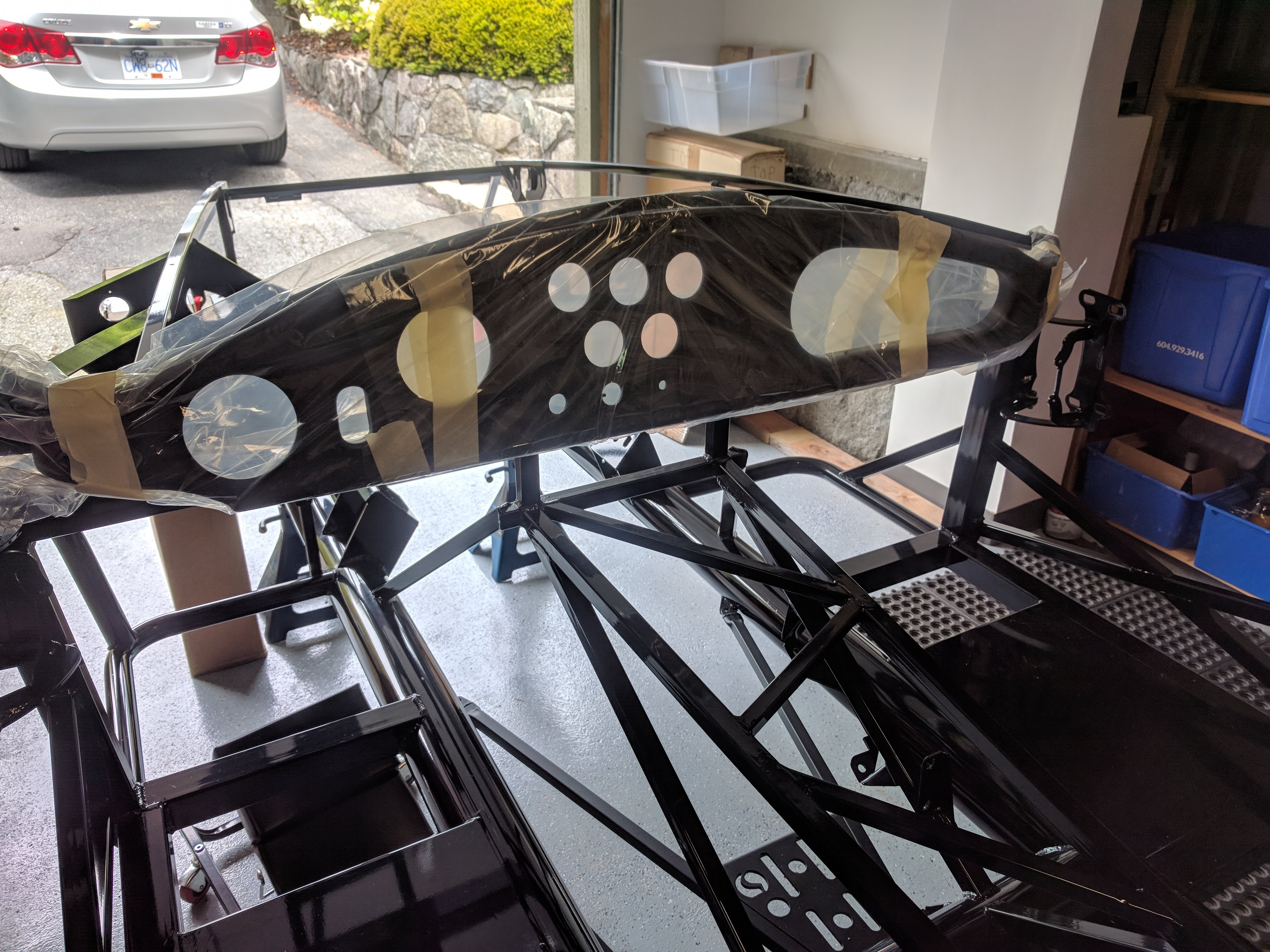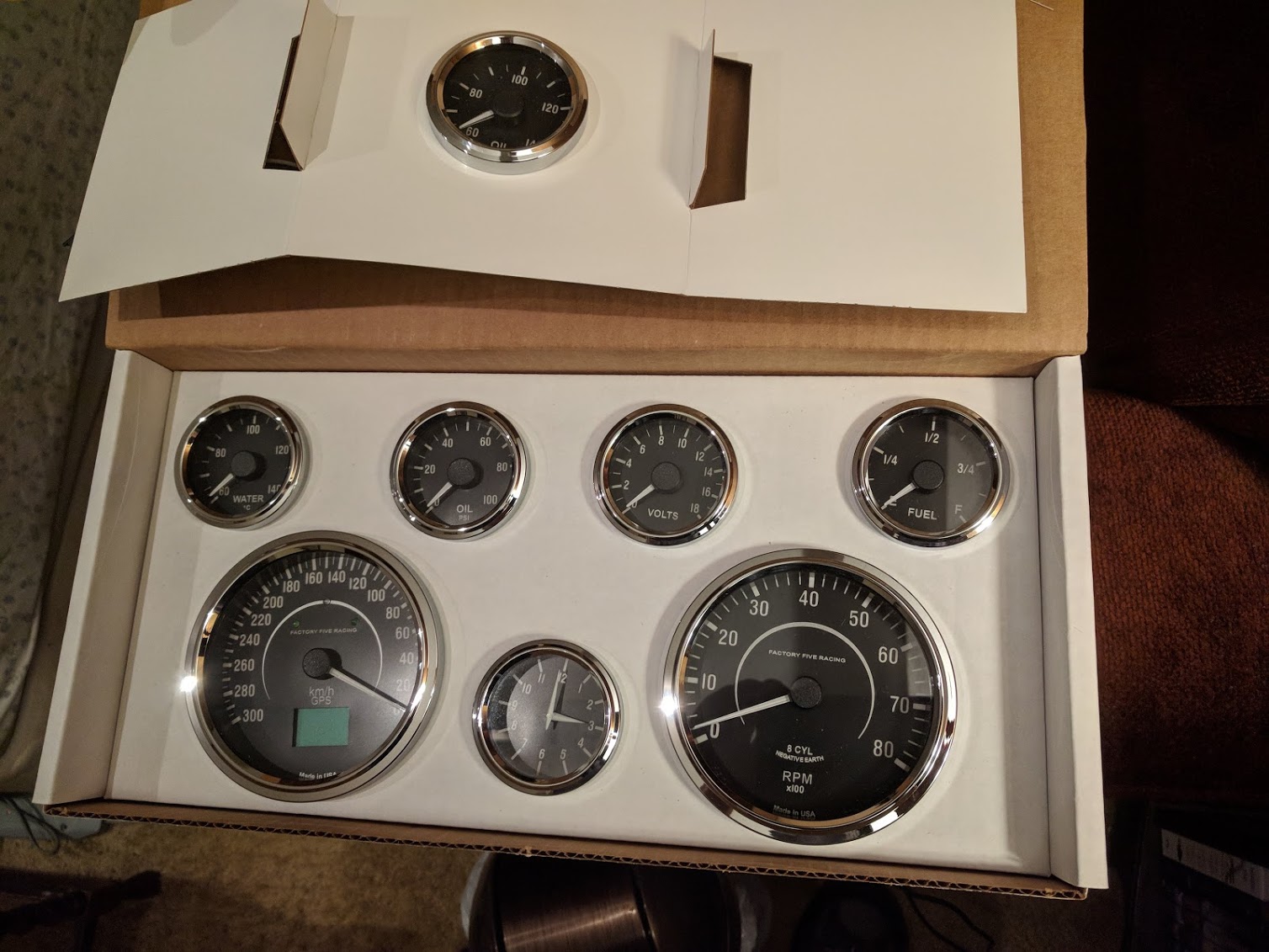 A mock-up of the interior with the Dask board install with tape. May 13, 2018My dials including reverse speedometer. Other dials water temperature, oil pressure, volts, fuel level, clock, tachometer and oil temperature. May 18, 2018Parking brake or E-brake. July 29, 2018Mock-up of carpeting cockpit looking at the dash. May 20, 2018Mock-up of carpeting left cockpit. May 20, 2018Mock-up of the carpeting the back of the cockpit. May 20, 2018
